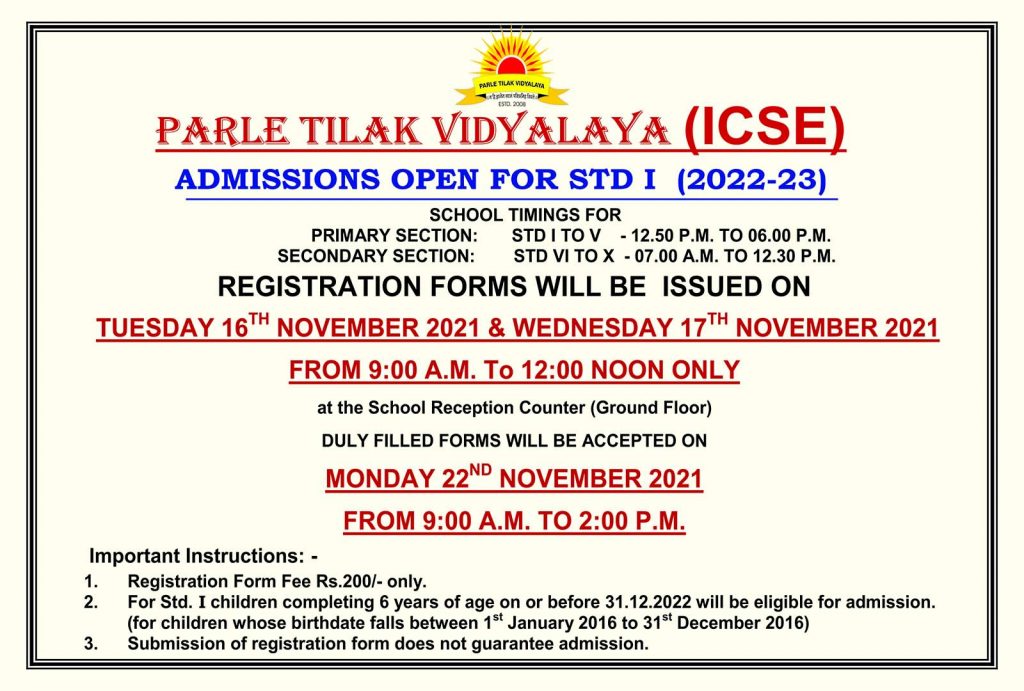 The Parle Tilak Vidyalaya (ICSE) is a co-educational institution, established in 2008 and was granted Permanent Affiliation by the ICSE Council on 27th May, 2016.
