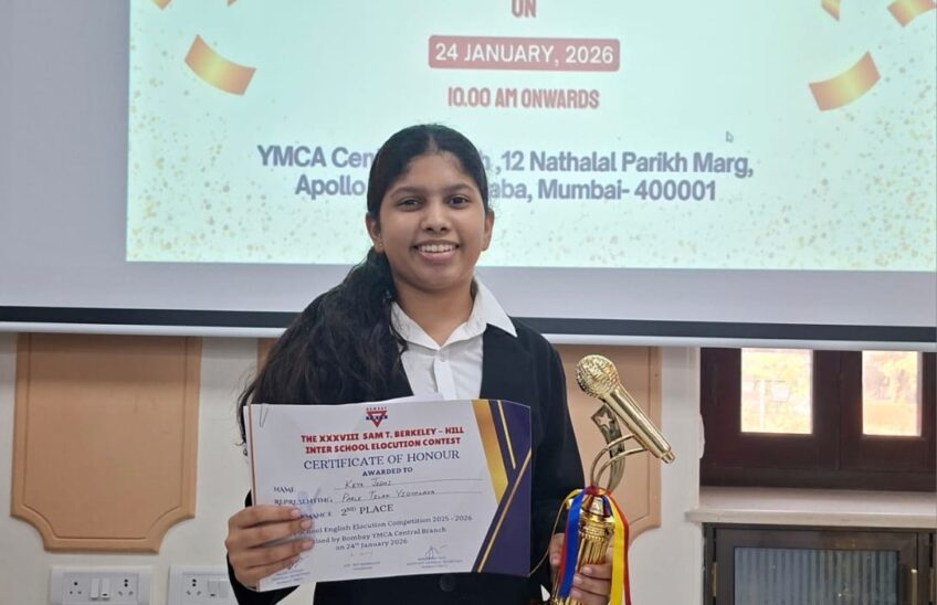 Keya Joshi secured 2nd place in the Sam T Berkeley-Hill Interschool English Elocution Contest, organized by Bombay YMCA Central Branch on 24 January 2026. Her exceptional elocution skills and confidence earned her a well-deserved spot among the top winners.