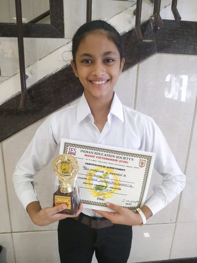 Sajiree Lele, a talented student of Class 10, has secured a remarkable achievement by clinching the third place at ANKURAM in ‘ JAM (Just a Minute)’ English speech competition organised by IES Manik Vidyamandir, Bandra on 2nd September 2023. Her eloquence and speaking skills captivated the audience and judges alike. The competition was held among 12 participating schools. Sajiree’s performance reflects her dedication and hard work, making our school proud. Congratulations to her on this outstanding accomplishment!