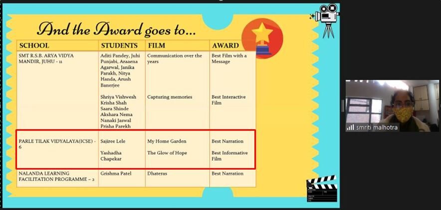 specializes in Theatre for Young Audiences was the Chief Guest at the Prize Distribution Ceremony held on 9th February 2022. We are proud to announce that Sajiree Lele from grade 8 won the ‘Best Narration Award’ for her film ‘My Home Garden’ and Yashada Chaphekar from grade 7 won the ‘Best Informative Film Award’ for her film ‘The Glow of Hope’.