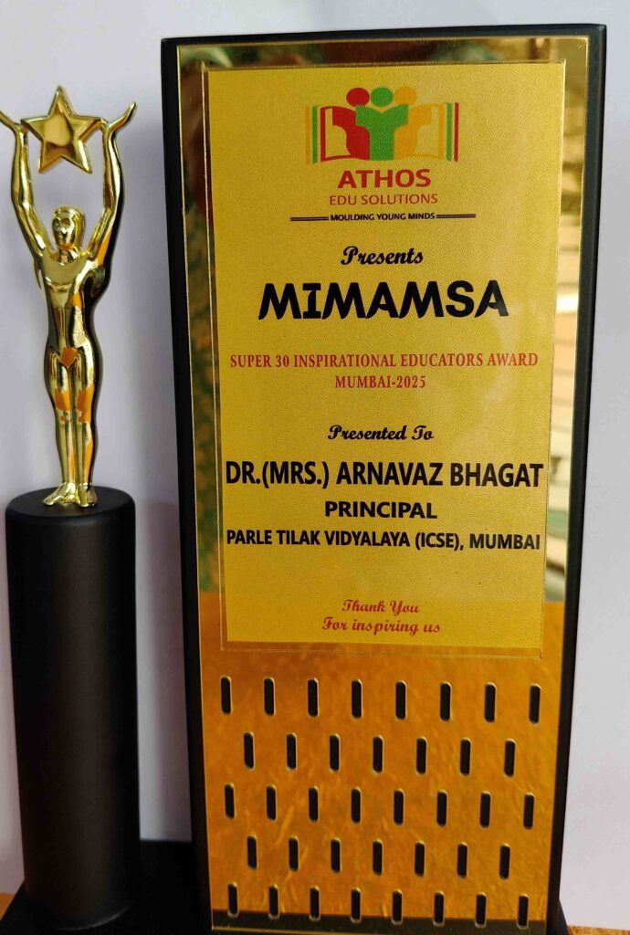 We are delighted to share that Dr. Mrs. Arnavaz Bhagat, Principal, Parle Tilak Vidyalaya (ICSE) has been honored with the prestigious ‘Super 30 Educators Award 2025’ at Maharashtra’s premier Principal’s Conclave and Award Ceremony, MIMAMSA, Mumbai Chapter. The event, held at Hotel Radisson Blu, Andheri, was organized by Athos Edusolutions in collaboration with MISA (Members of International Schools Association). Following a rigorous evaluation of renowned schools across 500 nominations from schools in Nagpur, Indore, Pune, Mumbai, Bhopal and Ranchi only 30 Educators from SSC, ICSE, CBSE, IGCSE, and IB boards were shortlisted by the distinguished jury. We are proud to announce that Dr. Bhagat was recognised as one of the 30 Educators for her outstanding contribution in the field of Education.