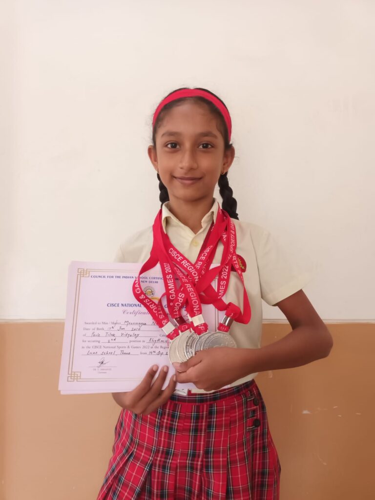 At the CISCE Regional Rhythmic Gymnastics held at Euro School, Thane on 14th September 2022, Mrunmayee Kunder of grade 7 secured the second place in Ribbon, Club, Hoop and Ball events of gymnastics and was felicitated with five medals and certificates. Congratulations to the budding gymnast who is going to represent the state of Maharashtra at the National level.