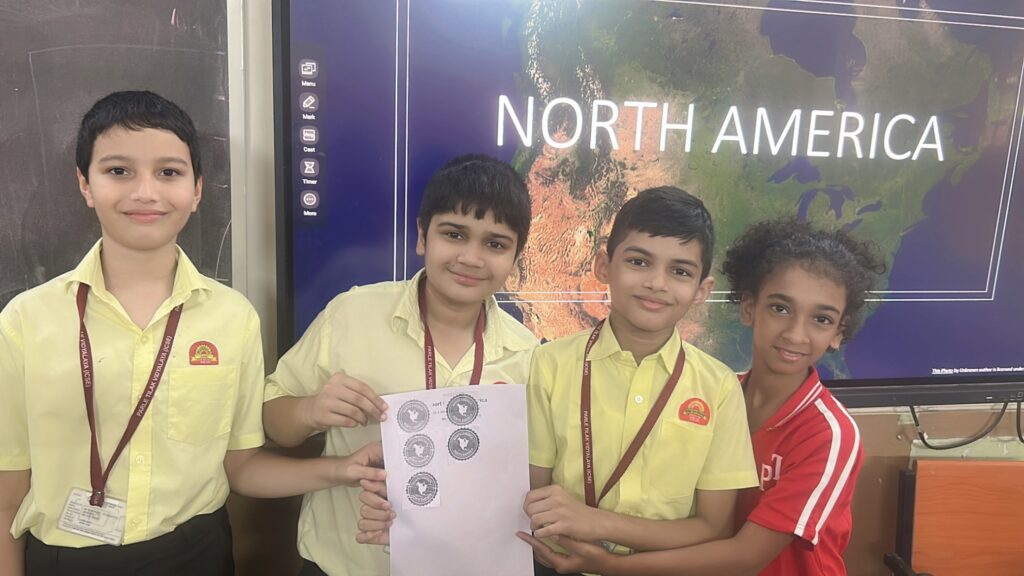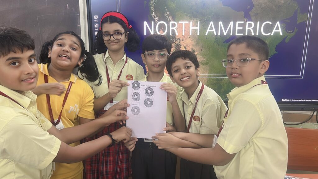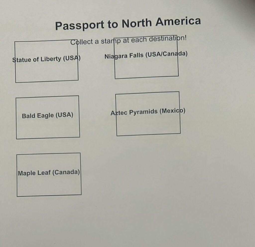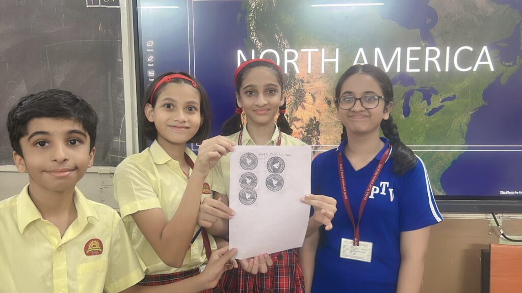 Each student was given a specially designed passport worksheet, where they collected “stamps” by answering clues related to places like the Statue of Liberty, Niagara Falls, the Canadian Maple Leaf, the Aztec Pyramids, and animals like the Bald Eagle. The activity helped spark curiosity and build a foundation for deeper understanding of the continent.