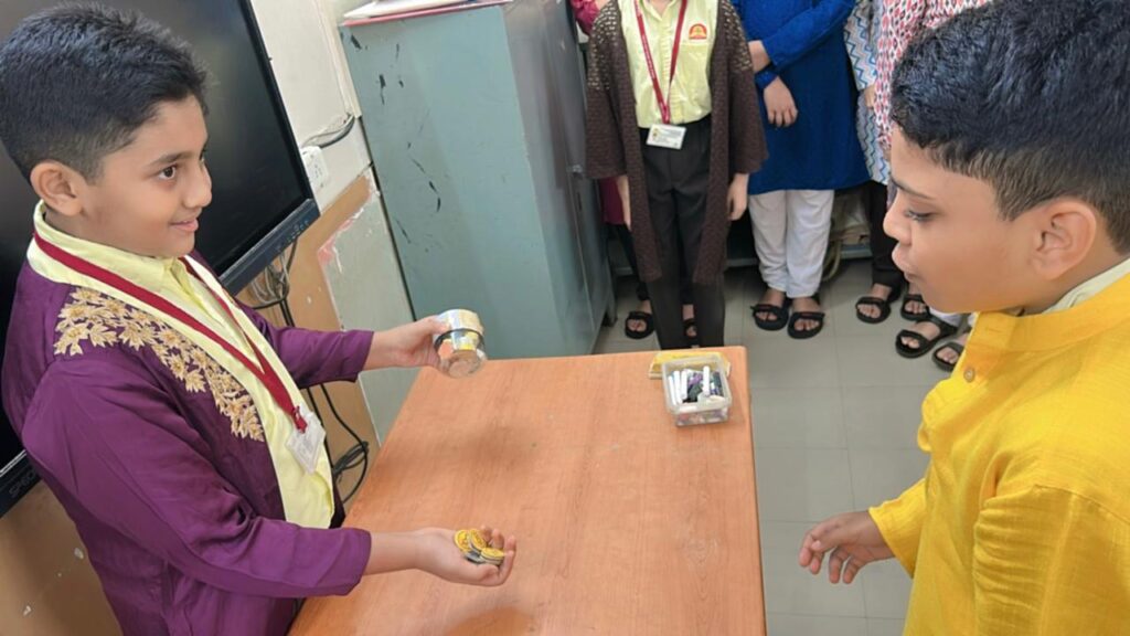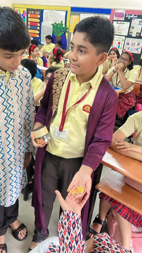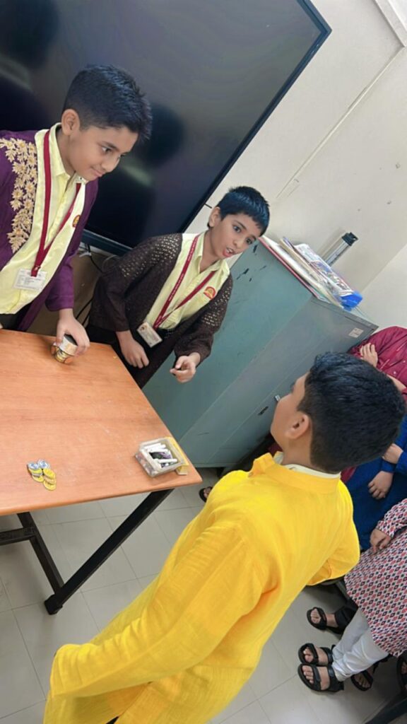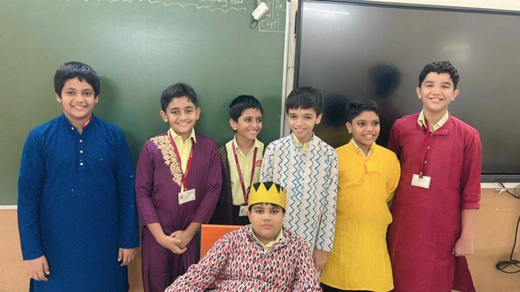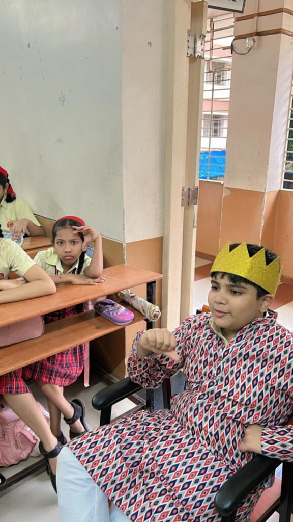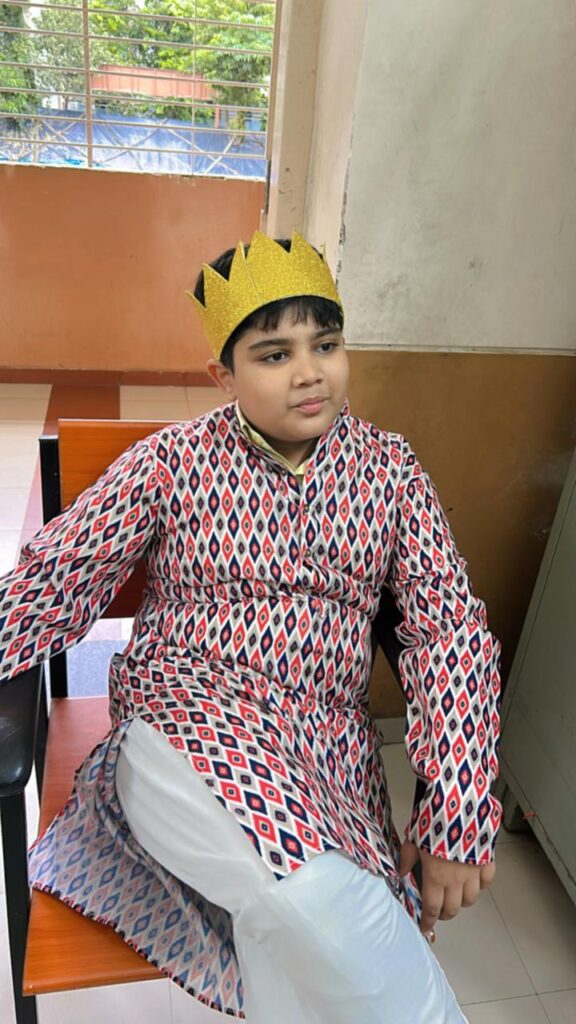 Children dressed up as historical characters including Alauddin Khilji, Malik Kafur, market officers, nobles, spies, and townspeople. Using props like crowns, robes, coins, scrolls, and a printed map of the empire, they brought the era alive. As the time traveler interviewed each character, students shared information about military conquests, market reforms, and social life under Alauddin’s rule. The lively dialogues, realistic costumes, and dramatic setting helped students connect deeply with the lesson, making history not just something to be read—but something to be experienced.