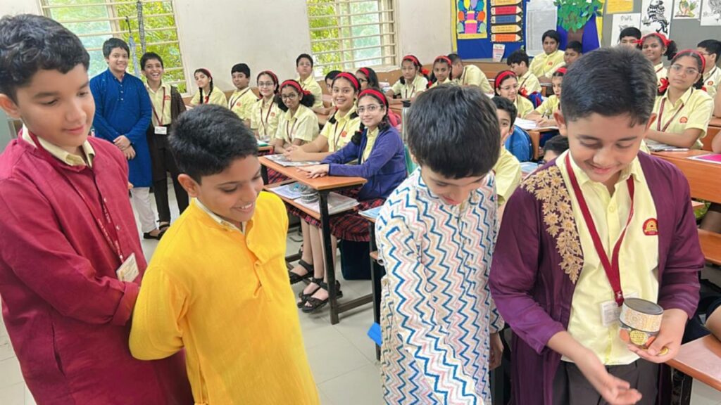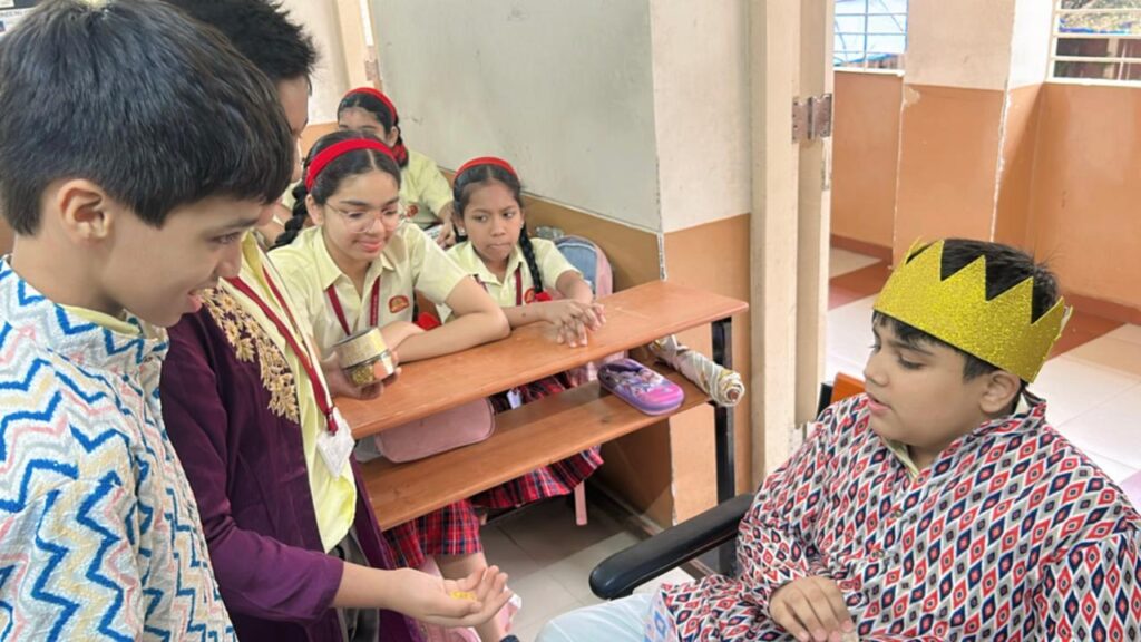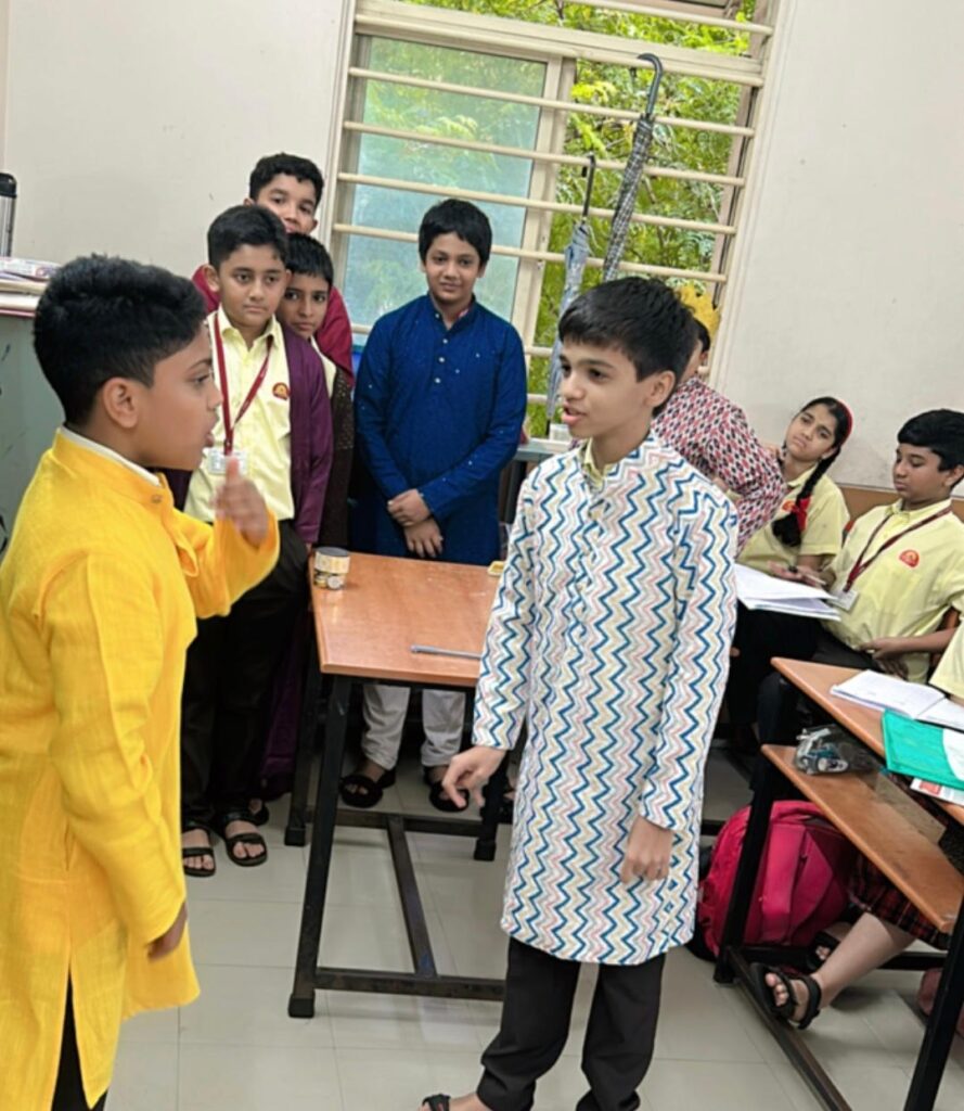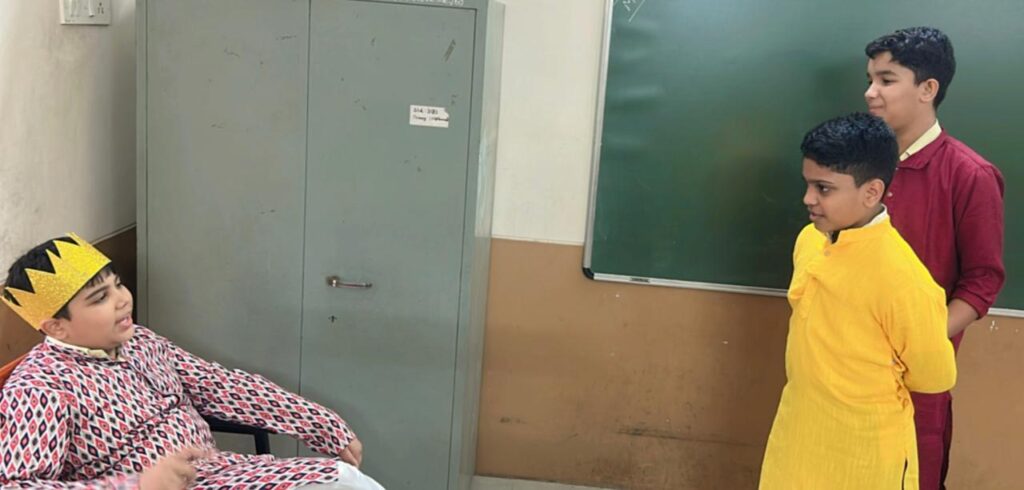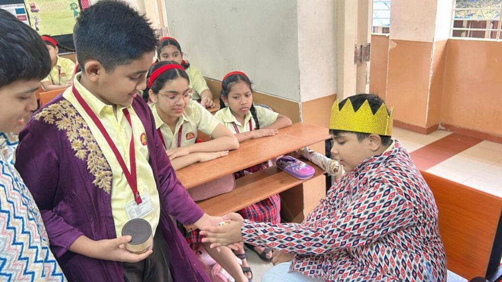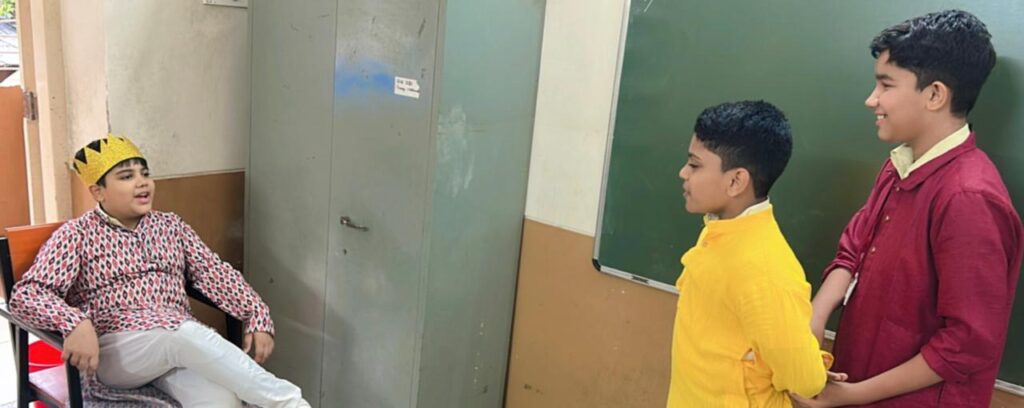 As part of the Grade 7 History lesson on Expansion of the Delhi Sultanate, students of Parle Tilak Vidyalaya (ICSE) participated in a creative role-play titled “Interviewing the Delhi Sultanate.” The story followed a curious boy who travels back in time to the reign of Alauddin Khilji. As he walks through the Sultan’s capital, he admires the marble arches, the scent of sandalwood in the air, and the beauty of pearls, beads, and ancient market stalls. He even visits one of the early coffee houses. His unfamiliar clothes and mannerisms attract attention—some call him a sorcerer, others believe he’s a divine messenger. The people eventually guide him to the grand Diwan-i-Aam, where Alauddin Khilji sits in court.