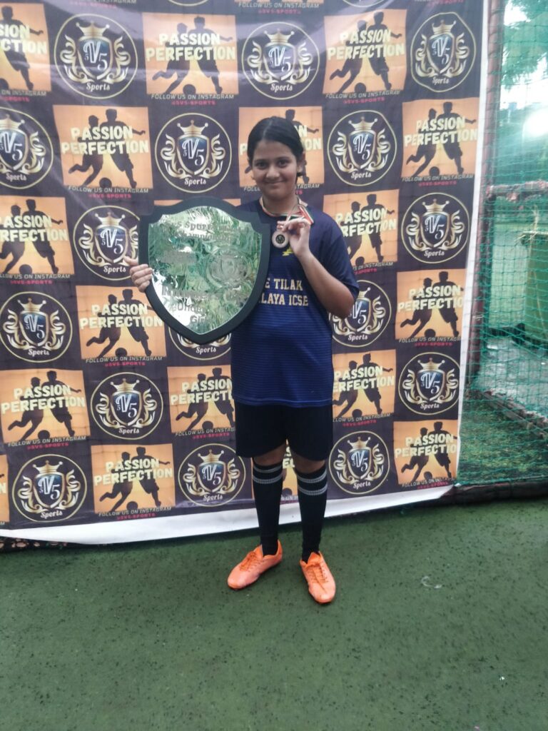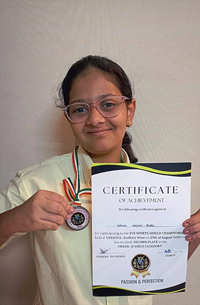 Aahana Bhalla, a dedicated student of Parle Tilak Vidyalaya (ICSE) studying in grade 7, had represented PTV ICSE in the football tournament and was in the PTVA team in the 5V5 Sports Shield Championship. Her team achieved an impressive feat by securing the position of first runner-up in the 5V5 Sports Shield Championship. The event had taken place on August 27, 2023, at St. Mary’s School. Competing in the under 15 girls category, Aahana’s remarkable performance earned her a well-deserved silver medal and a certificate. Her dedication, skill, and sportsmanship have brought pride not only to herself but also to the entire school. We congratulate Aahana Bhalla for this outstanding achievement!