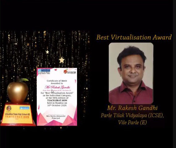 Mr. Rakesh Gandhi a senior Mathematics and Physics teacher, has been awarded for BEST VIRTUALISATION in the prestigious TEACHERATHON 2020 organised by Lilavatibai Podar School.