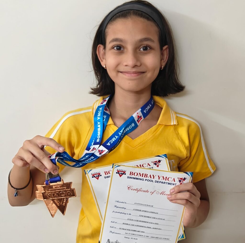 Heartiest congratulations to Anannya Saudagar, Grade 6 student of Parle Tilak Vidyalaya ICSE, for her commendable performance at the 52nd Bombay YMCA Swimming Gala 2026, held at YMCA, Agripada on 7th & 8th February 2026.