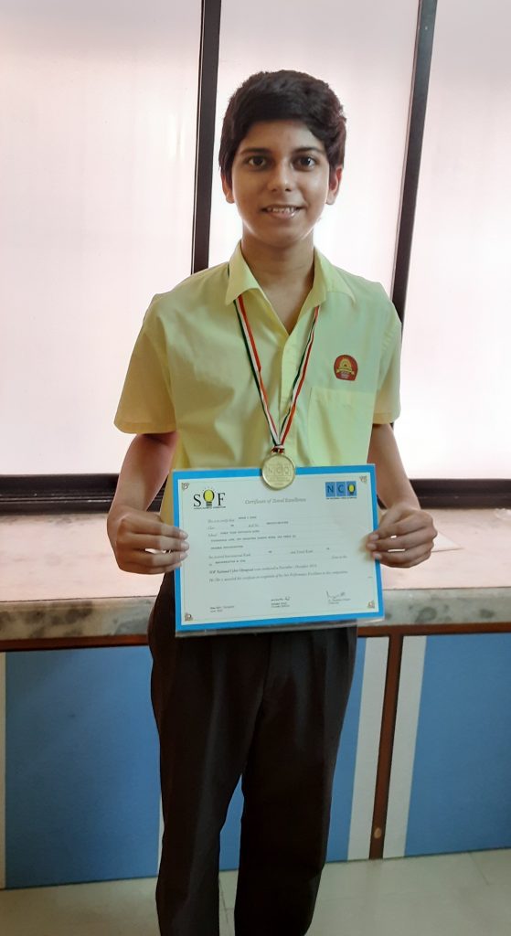Mihir Joshi of class 9 received gold medal and certificate of excellence for securing 16 th rank at zonal level.